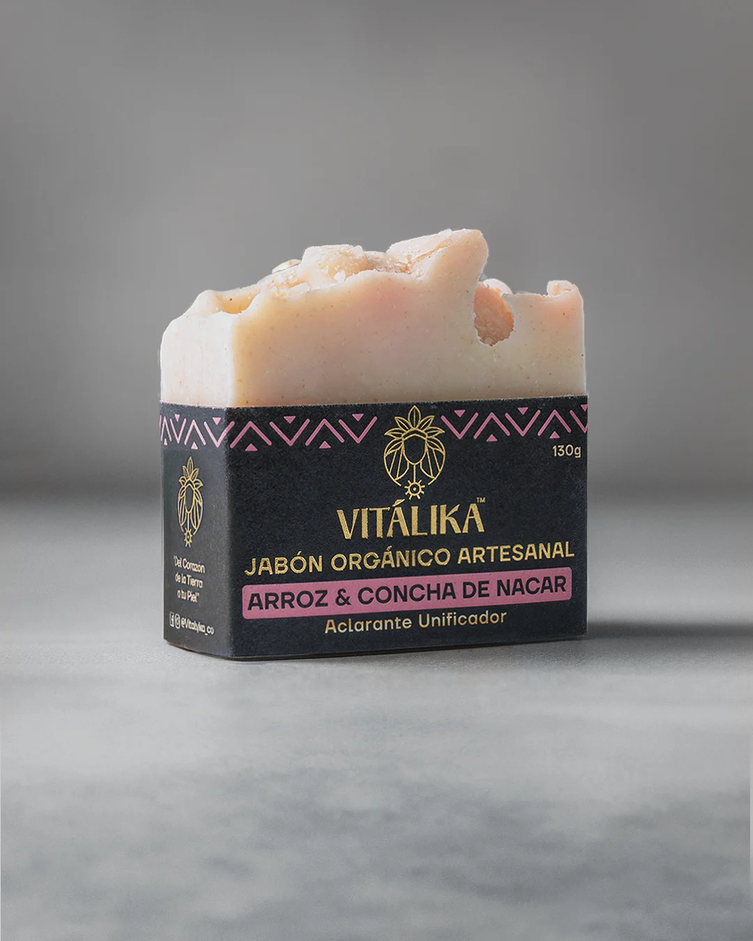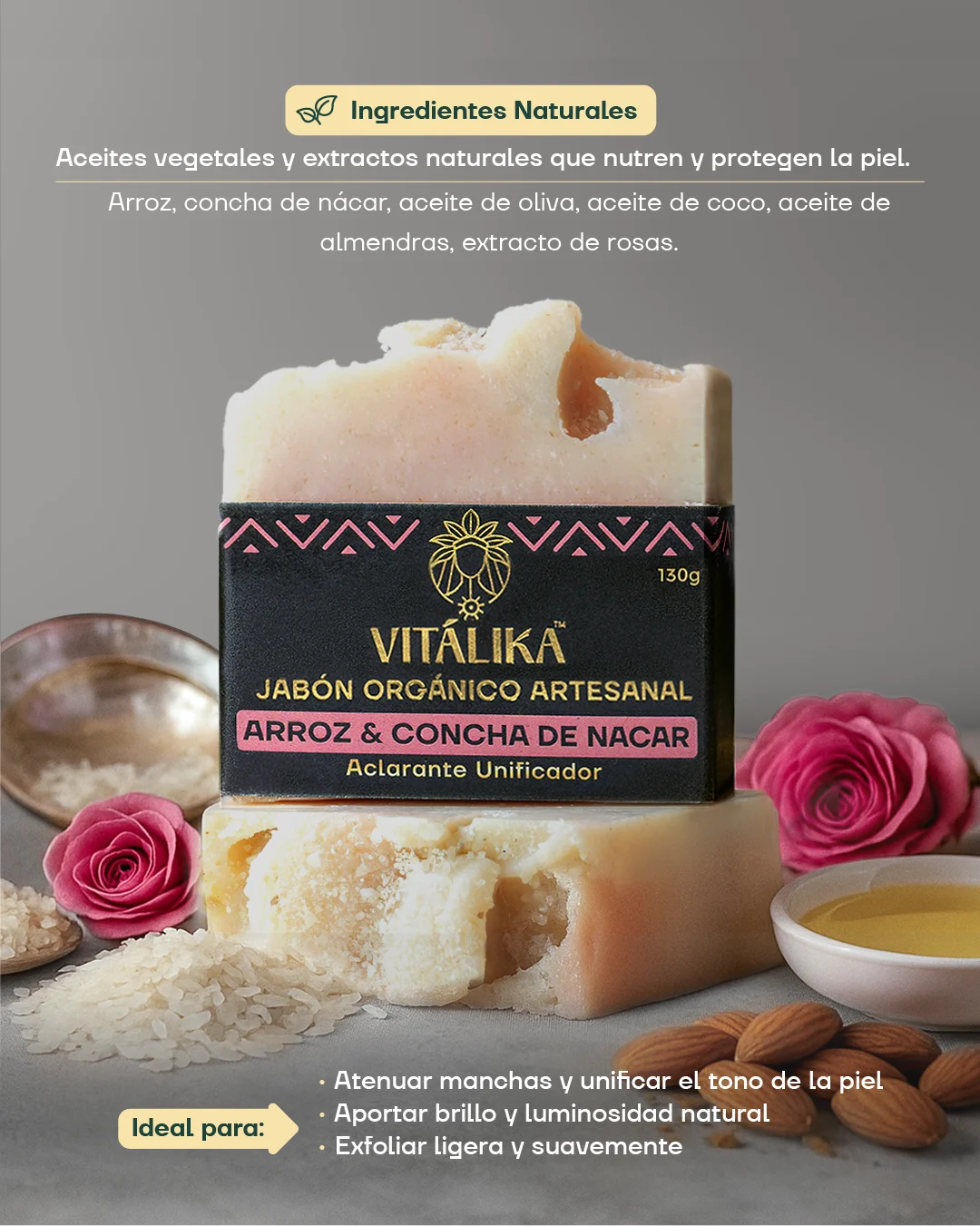 Jabón natural con arroz y concha de nácar. Ayuda a reducir manchas, empareja el tono de la piel y aporta luminosidad natural. Suaviza, limpia y regenera sin resecar. Ideal para una piel más uniforme, fresca y radiante.
