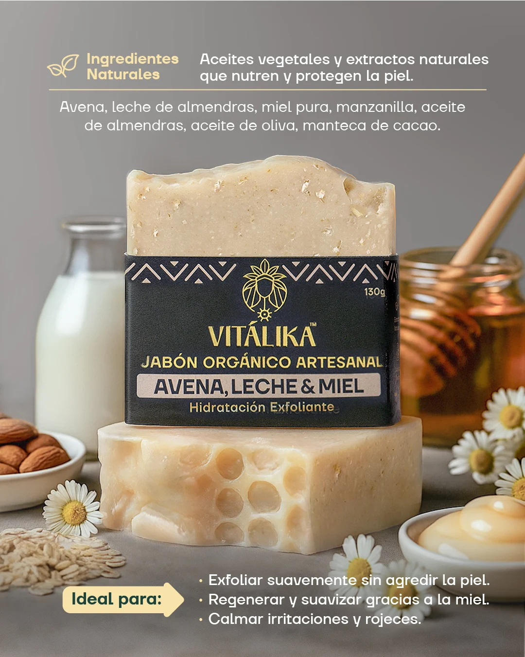 Jabón natural con avena finamente molida, leche de almendras y miel pura. La avena limpia y exfolia delicadamente, liberando tu piel de impurezas. La leche nutre y suaviza, y la miel actúa como un elixir regenerador y calmante. La sensación después de usarlo es de renovación: tu piel queda limpia, hidratada y luminosa. Un jabón hecho para conectar contigo y con la naturaleza.