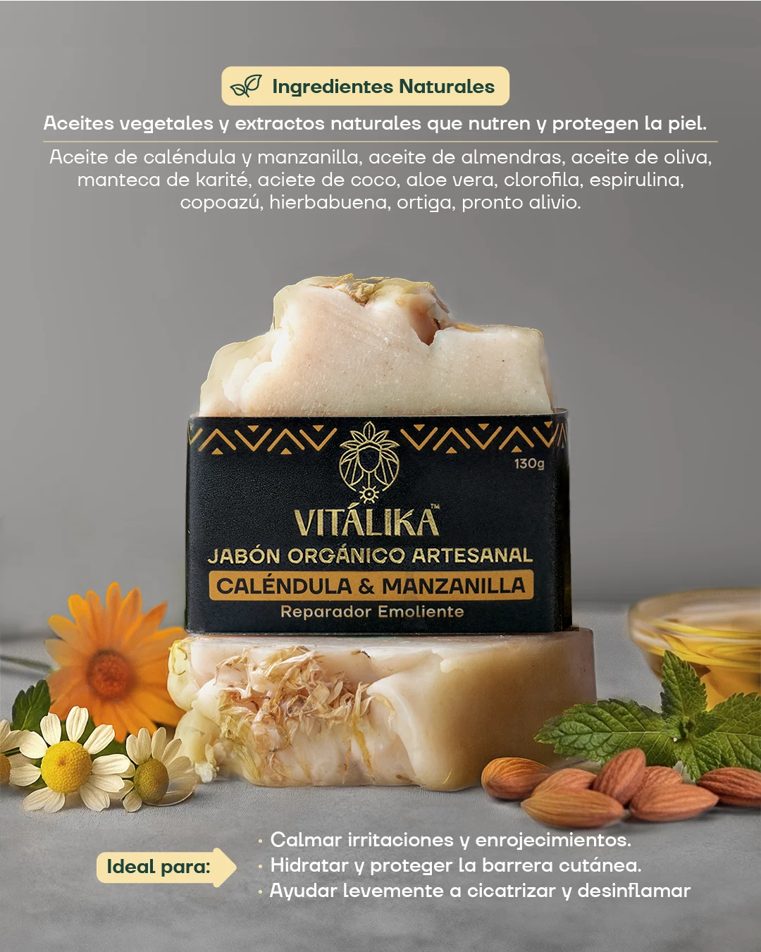 Jabón natural formulado con extractos de plantas tradicionalmente usadas para el cuidado delicado de la piel. Con propiedades antiinflamatorias, antisépticas y antibacterianas que ayuda aliviar irritaciones, inflamaciones y afecciones cutáneas como acné, rosácea, y dermatitis. Hidrata y nutre profundamente, ayudando a prevenir arrugas, manchas y flacidez. Ideal para piel sensible y cuidado de la zona intima.